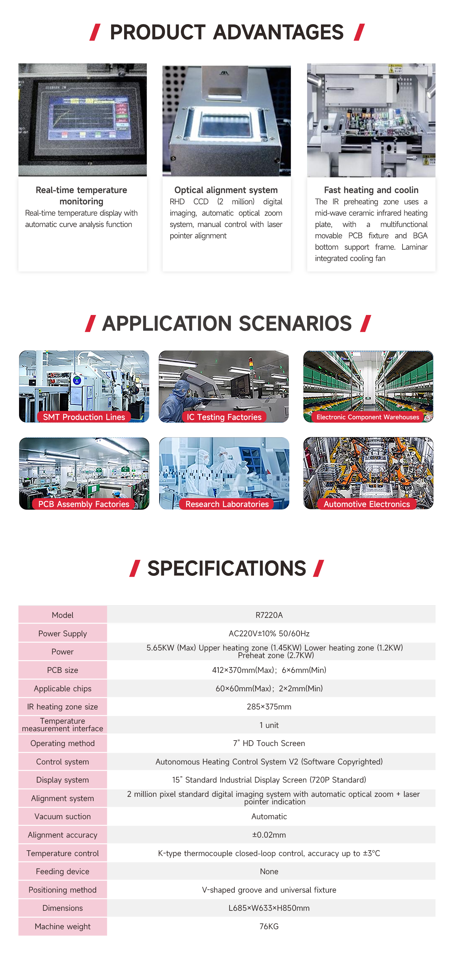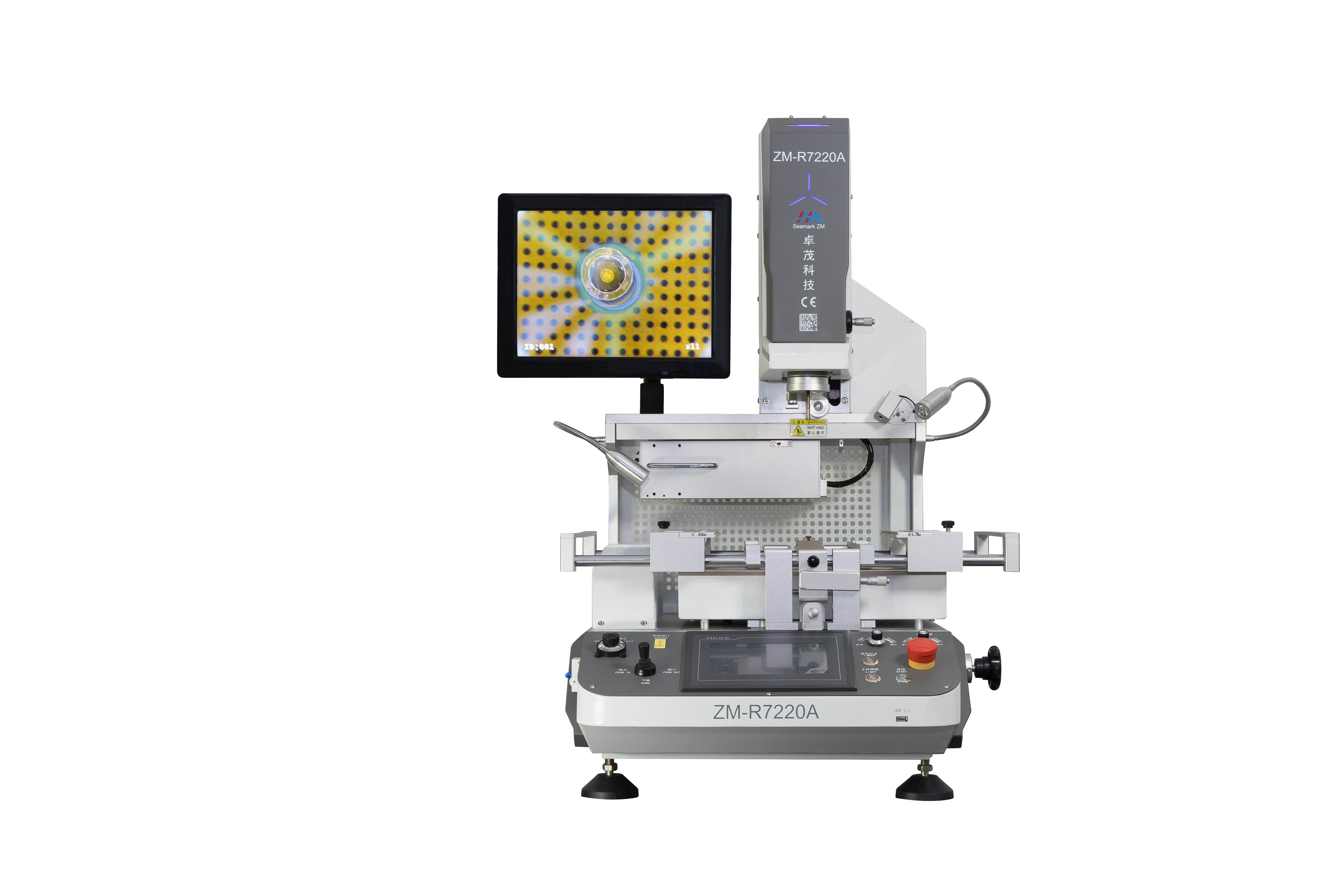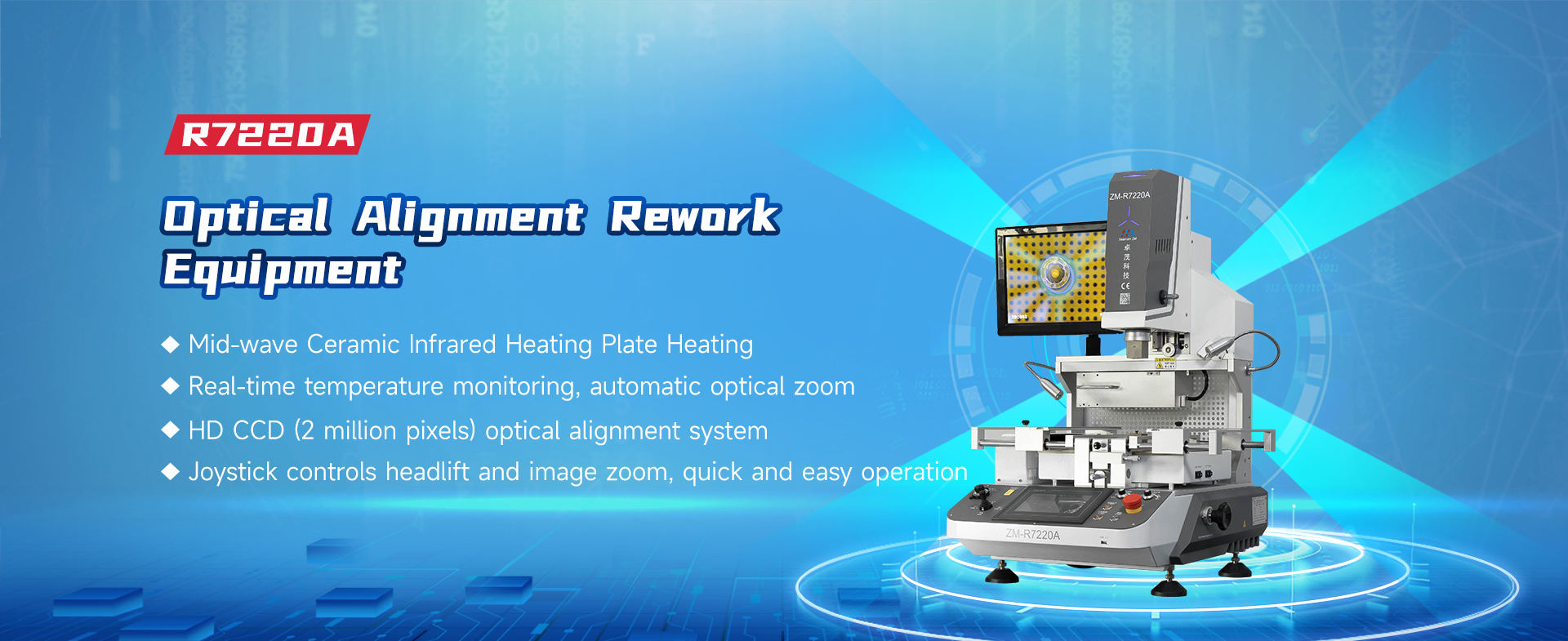 The ZM-R7220A is a versatile optical alignment automatic repair device featuring real-time temperature monitoring, automatic optical zoom, and joystick-controlled head elevation and image scaling. Its high-definition optical alignment system enables precise splitting, magnification, reduction, and fine-tuning. The device also incorporates medium-wave ceramic infrared heating plates, a multifunctional mobile PCB mounting bracket, and a BGA bottom support frame.