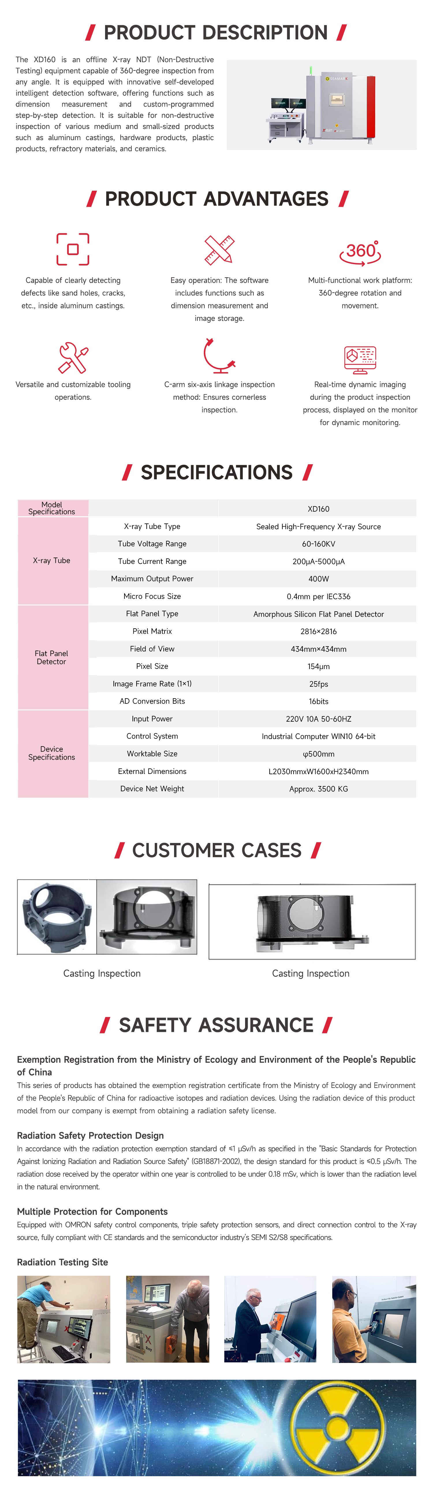 XD160 X-RAY inspection machine uses a radiation tube to emit X-rays that penetrate the object being inspected. Depending on the density and thickness of the object being inspected, the absorption and reflection characteristics of the X-rays are different. The detector receives the X-ray information that penetrates the object and converts it into grayscale information, which is then transmitted to the computer. The computer uses image processing software to denoise and sharpen the original image, displaying the internal structural state of the object clearly and storing the data locally as needed.