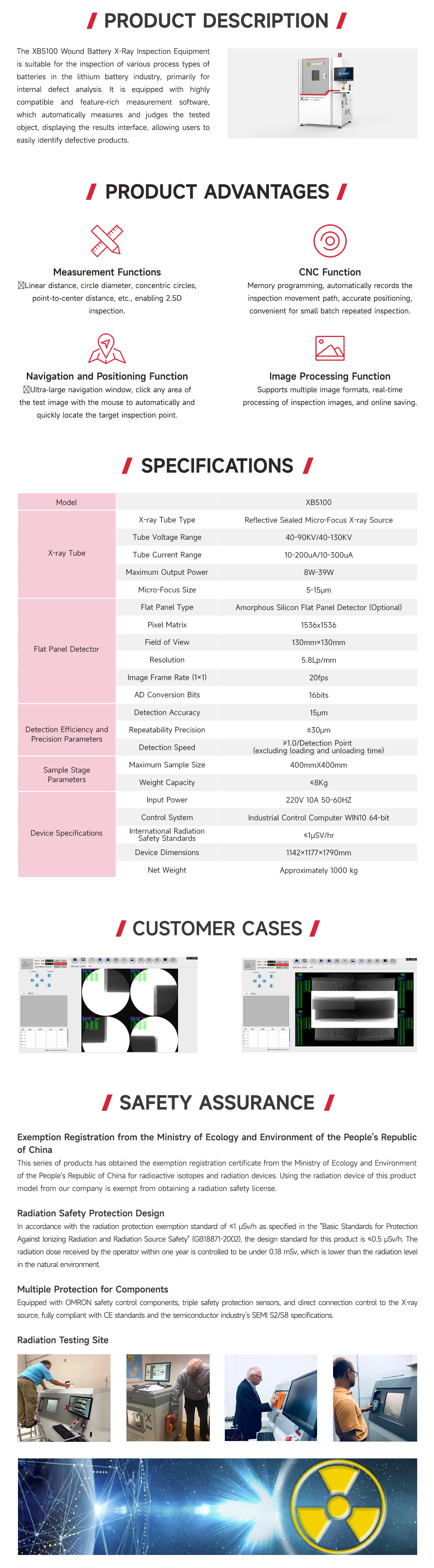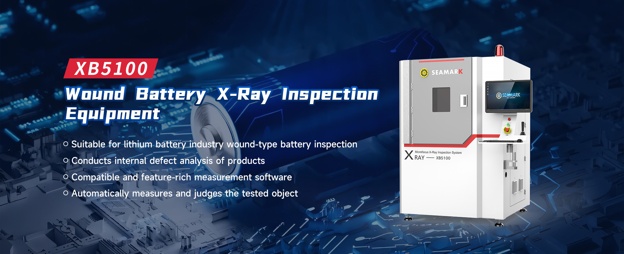 XB5100 winding battery X-ray inspection equipment is designed for inspecting various types of batteries in the lithium battery industry. It primarily analyzes internal defects of the product effectively. The device is equipped with highly compatible and feature-rich measurement software, which automatically measures and judges the test object, displaying the judgment results interface for easyidentification of defective products by users.