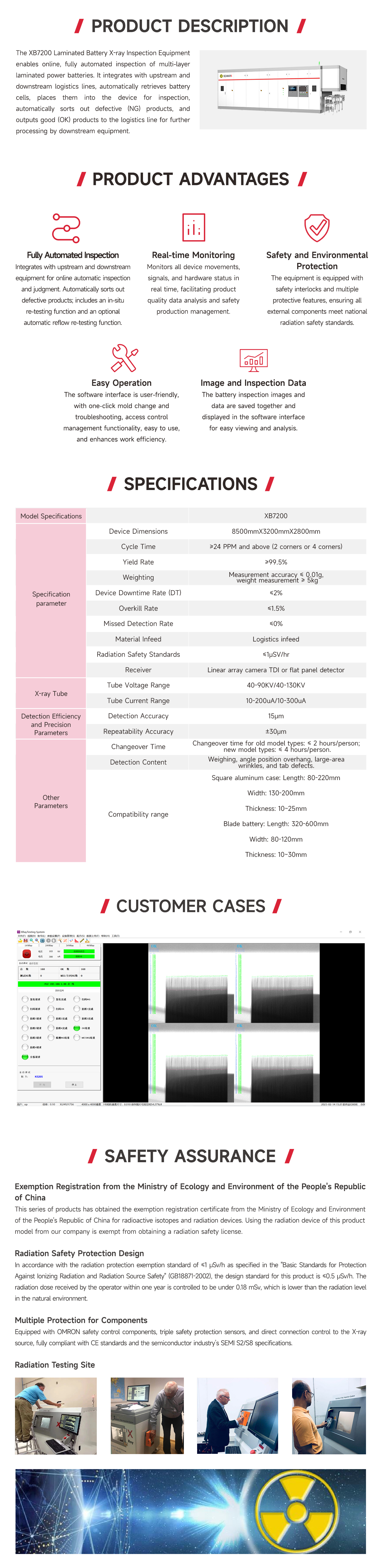 XB7200 stacking battery X-ray inspection equipment enables fully automatic inline inspection of multi-layer stacking lithiumion batteries. It integrates with upstream and downstream logistics lines, allowing for automatic battery picking, placement into the device for inspection, automatic sorting of defective (NG) products, automatic removal of acceptable (OK) products, and output to the logistics line for further processing by downstream equipment.