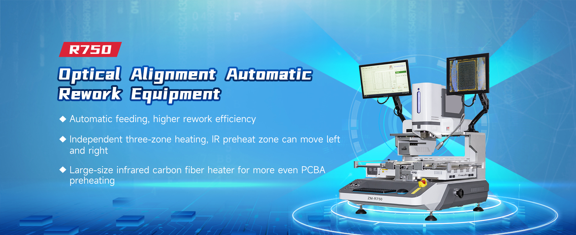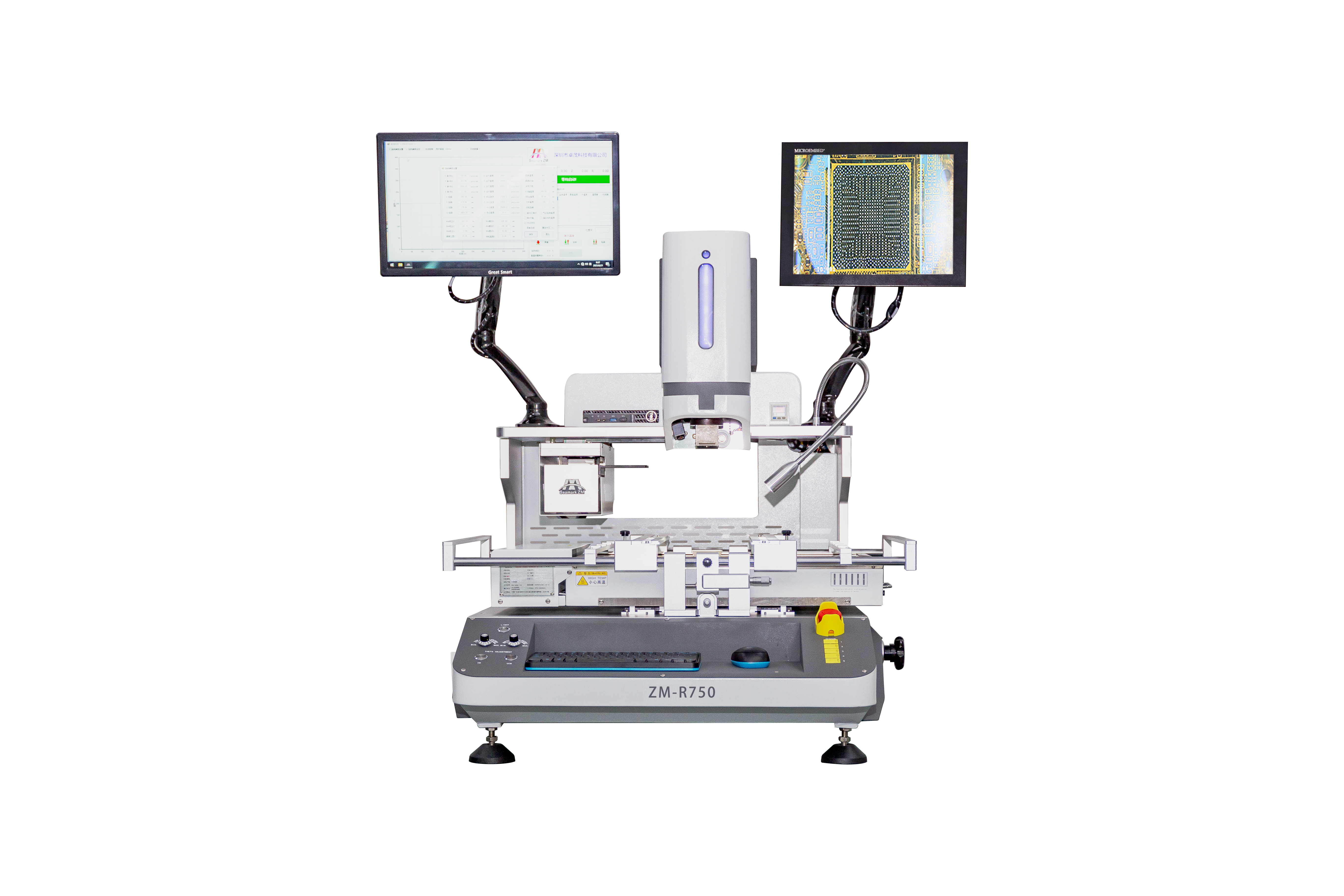 Alignment is performed through a PC control system, using a 19.5-inch high-definition industrial display screen and a 15 inch high-definition industrial display screen for operation. Independently controlled three temperature zones, heated by convective hot air, with adjustable height in the lower temperature zone and built-in vacuum suction tube in the upper temperature zone for BGA adsorption, it is equipped with negative pressure monitoring and pressure protection device; The IR preheating temperature zone adopts carbon fiber infrared tube heating and high-temperature resistant microcrystalline panel protection, which can be moved left and right for easy maintenance of large and irregular PCBA. Adopting a high-definition CCD high-precision optical alignment system, it can ensure the precise placement of components. Equipped with laser red dot positioning, it guides the rapid positioning of PCBs. The placement system adopts multiple working modes, without the need to set complex locking parameters.