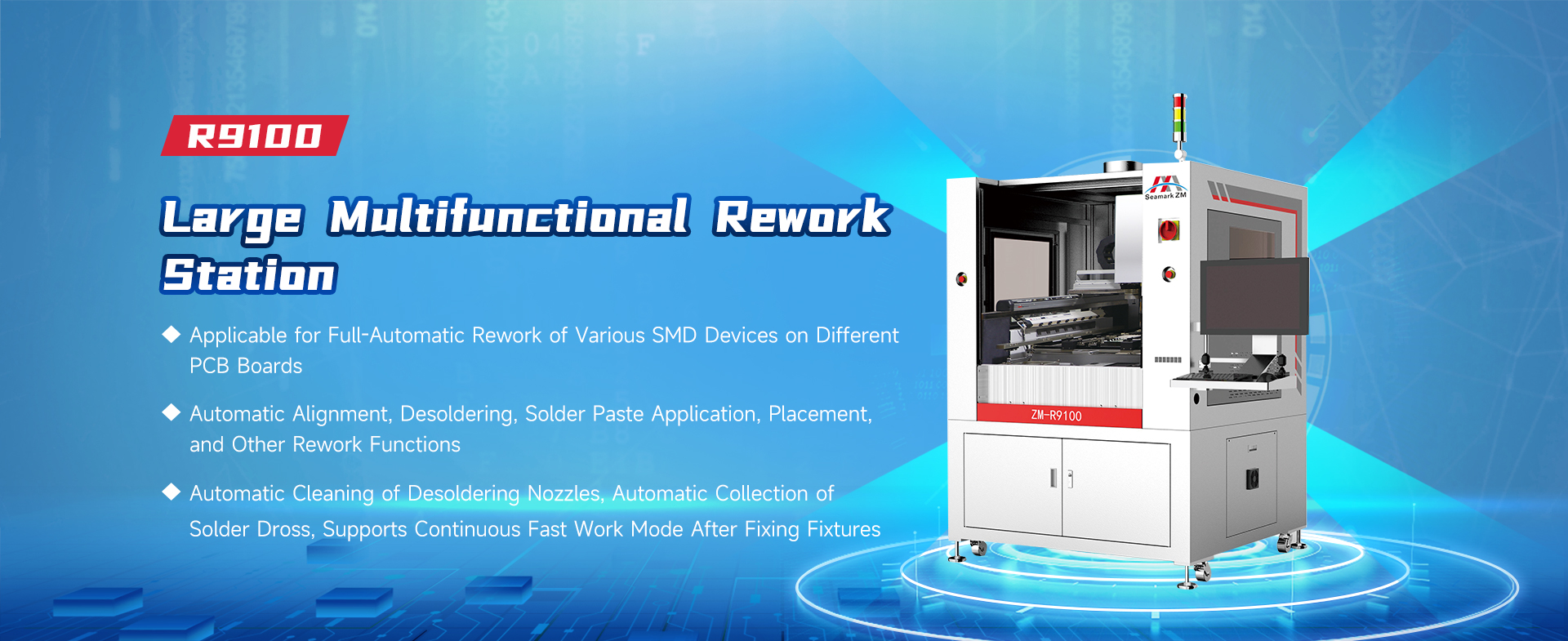 ZM-R9100 is a large-scale multifunctional precision intelligent rework station suitable for fully automatic rework of various surface mounting devices on PCB boards. It adopts high-precision visual cameras and independent temperature control technology, and automatically aligns through the equipment vision system to achieve rework actions such as disassembly, tin removal, dipping solder paste, mounting, and soldering. It supports continuous and fast working mode after fixing fixtures; The equipment can be integrated with MES software (optional) to achieve functions such as temperature curve analysis with S/N as the traceability condition.