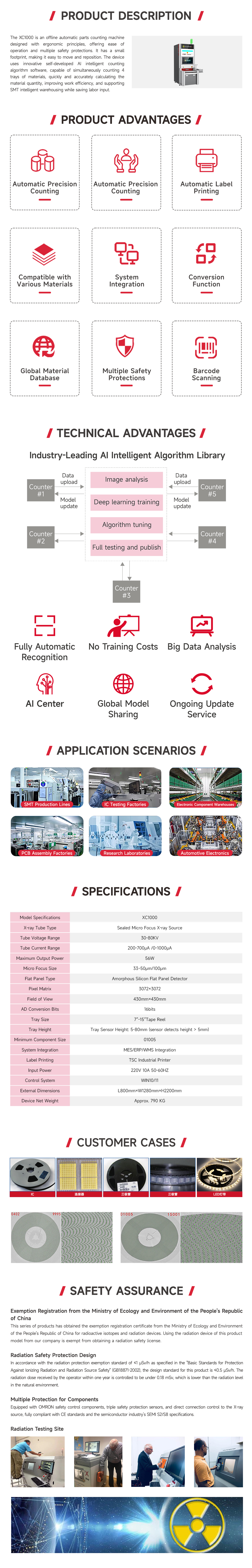 XC1000 is an offline automatic counting machine. The equipment design refers to ergonomics, easy to operate, and has multiple safety protections. lt occupies a small space and is easy to move the working position. The innovative self-developed Al intelligent counting algorithm software can count 4 trays at the same time, quickly and accurately calculate the material quantity, improve work efficiency, assist SMT intelligent warehousing, and save manpower investment.