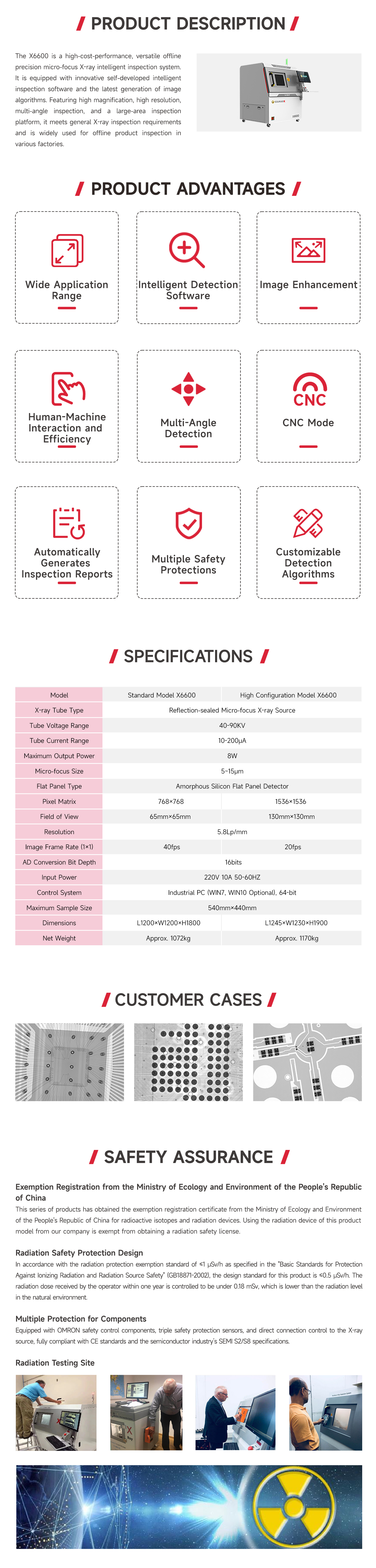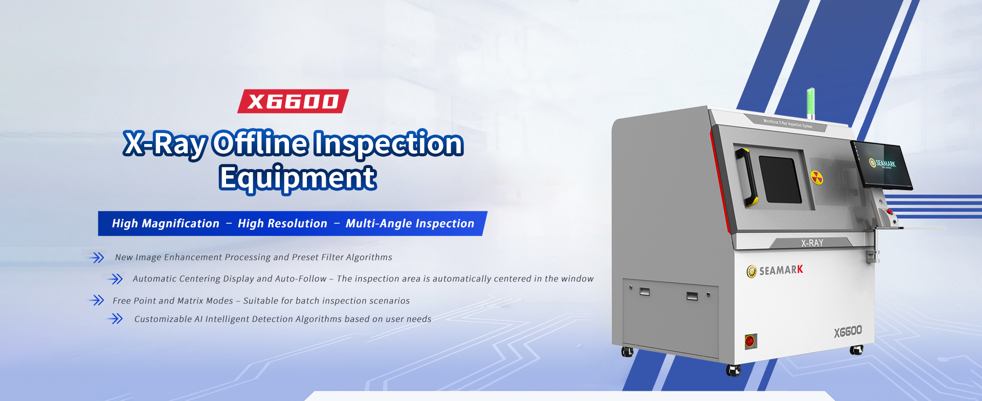 X6600 is a cost-effective general-purpose offline precision micro-focus X-ray intelligent inspection equipment, equipped with innovative self-developed intelligent inspection software and a new generation of image algorithms. lt has the characteristics of high magnification, high resolution, multi-angle inspection, large area inspection platform, etc. lt meets the general X-ray inspection needs and has a wide range of applications. lt is suitable for the inspection of offline products in various factories.
