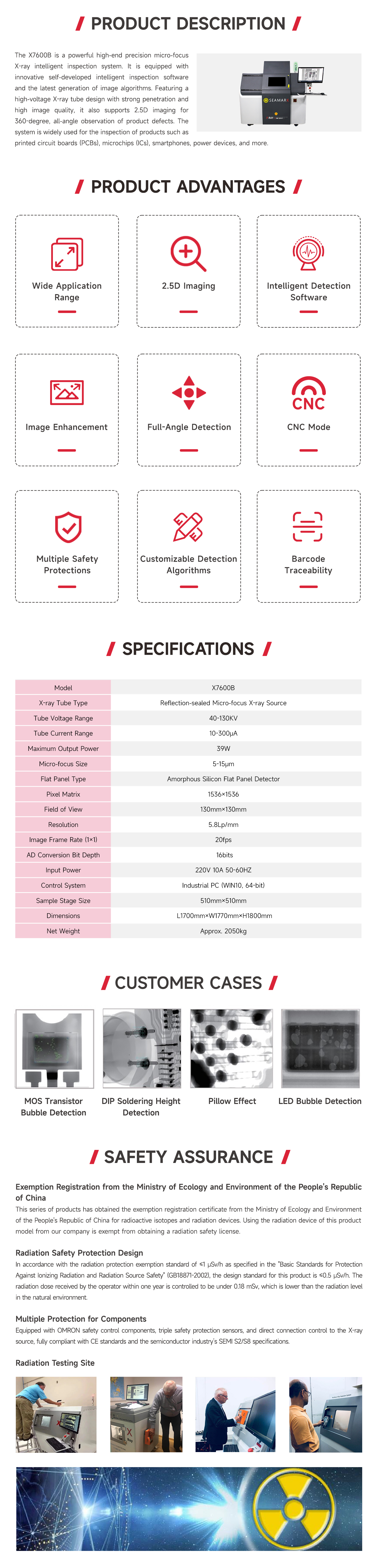 X7600B is a powerful high-end precision micro-focus X-ray intelligent inspection equipment, equipped with innovative self- developed intelligent inspection software and a new generation of image algorithms. lt adopts a high-voltage X-ray tube design with strong penetration and high image quality. lt has a 2.5D imaging function and can achieve 360-degree,all-round observation of product defects. lt is widely used in printed circuit boards(PCBs), microchips (lCs), mobile phones, power devices and other product inspections