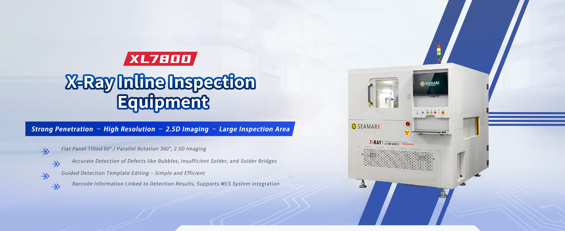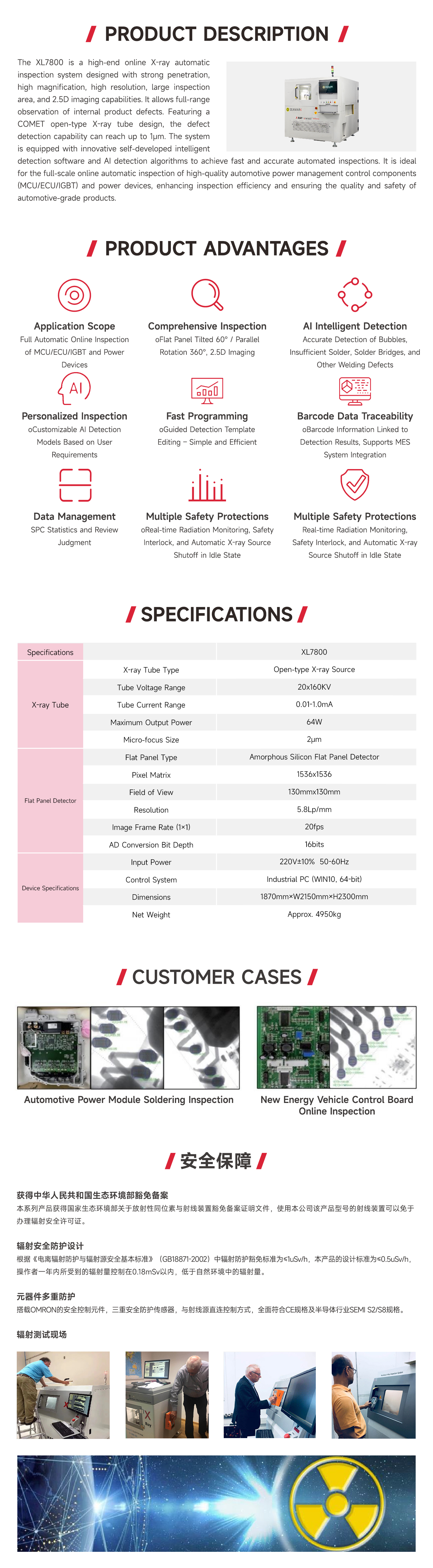 XL7800 is a high-end inline X-ray automatic inspection system with strong penetration capability, high magnification, high resolution, large inspection area, and 2.5D imaging. It allows comprehensive observation of internal defects in products. Featuring open X-ray tube design,its defect Inspection capability can reach up to 1μm.The system is equipped with innovative self-developed intelligent inspection software and Al Inspection algorithms,enabling fast and precise automatic inspection. lt is ideal for full inline automatic inspection of automotive power management controlcomponents (MCU/ECU/lGBT) and power devices, improving Inspection efficiency and ensuring product quality and safety for automotive-grade components.