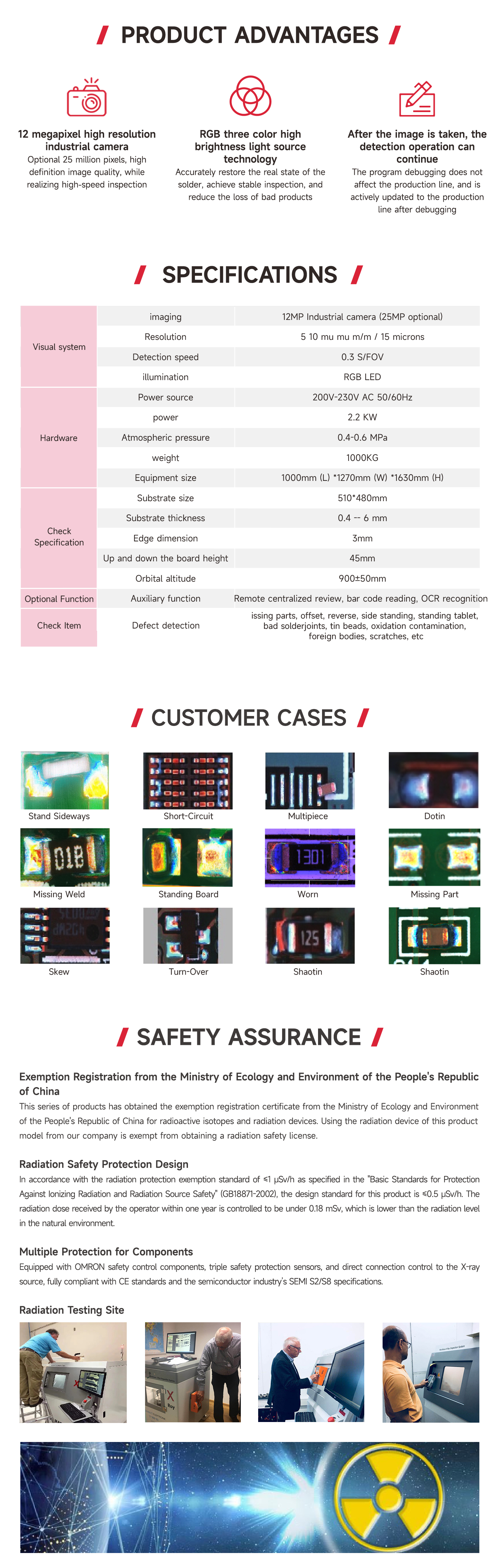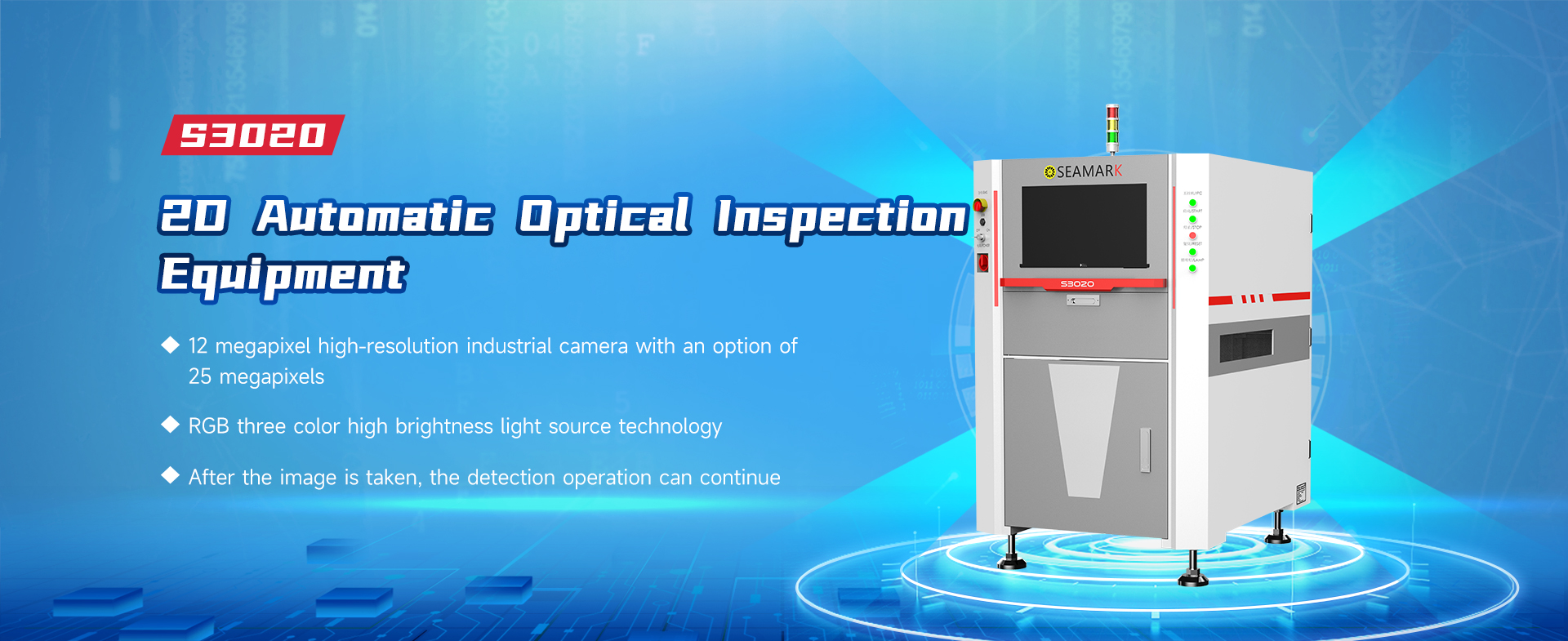 The equipment mainly uses pre-programmed automatic optical inspection of the SMT furnace front and back surface mount status. It is equipped with multi angle RGB light sources, high-resolution industrial cameras and telecentric lenses, high-definition imaging quality, and high-speed inspection. S3020 2D online automatic optical inspection equipment can inspect defects in SMT circuit boards, such as missing parts, offset, reverse, floating height, side standing, poor solder joints, solder beads, oxidation pollution, foreign objects, scratches, etc.