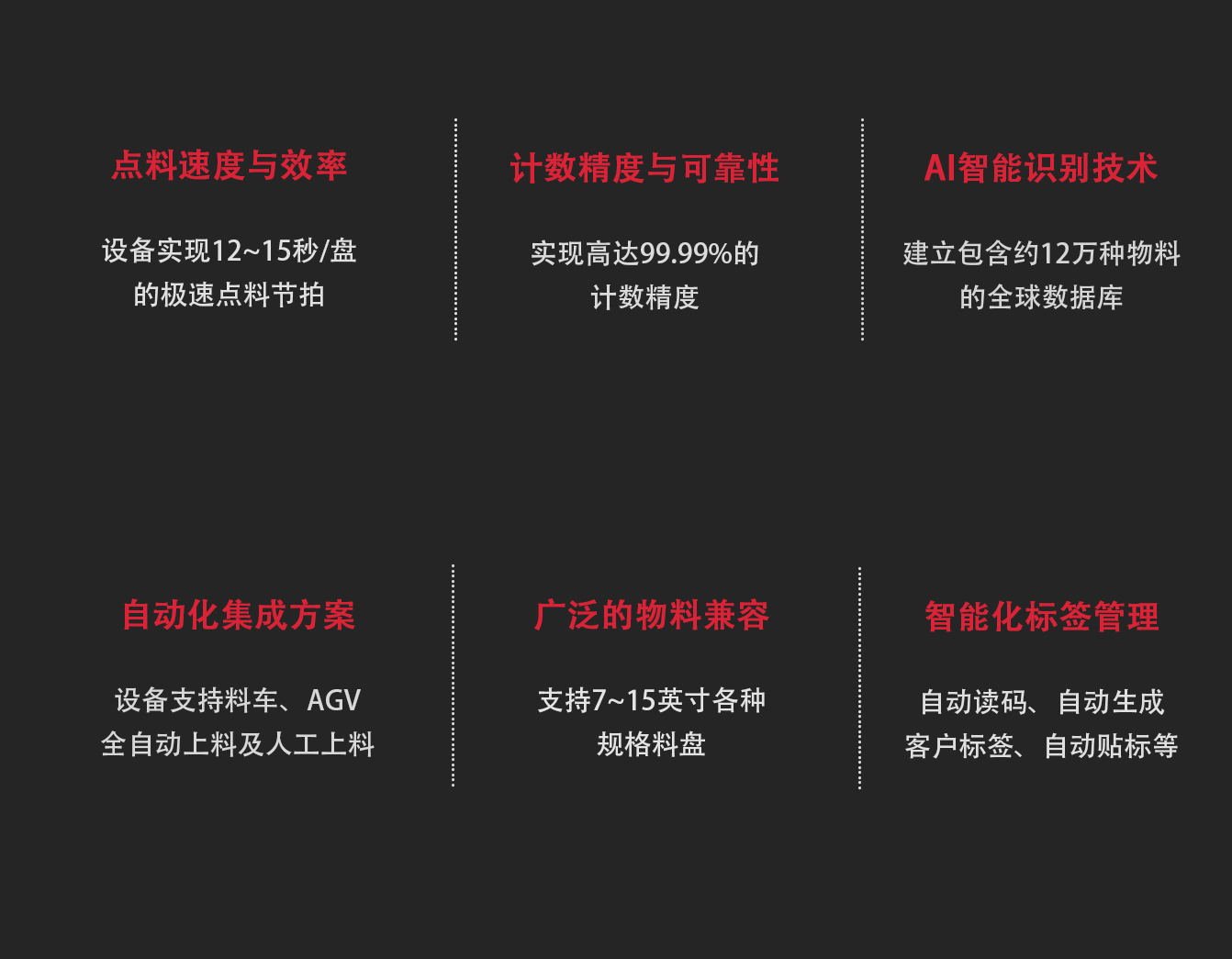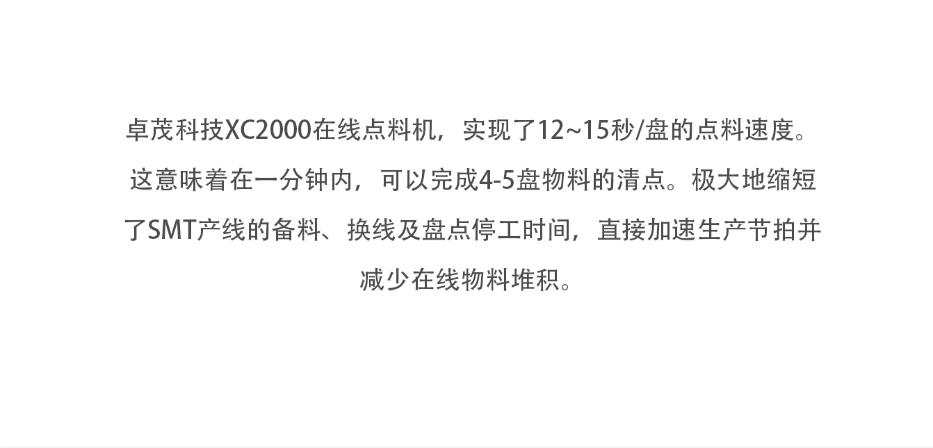 XC2000是一款在線式自動點(diǎn)料機(jī),創(chuàng)新自研AI智能點(diǎn)料算法軟件,12~15秒/盤的點(diǎn)料速度,精準(zhǔn)核算料盤中物料數(shù)量,支持全自動或人工等多種上料方式,設(shè)備可自動讀碼、貼標(biāo)、復(fù)核,助力SMT智能倉儲實(shí)現(xiàn)全自動物料盤點(diǎn),提高工作效率,節(jié)省人力投入。