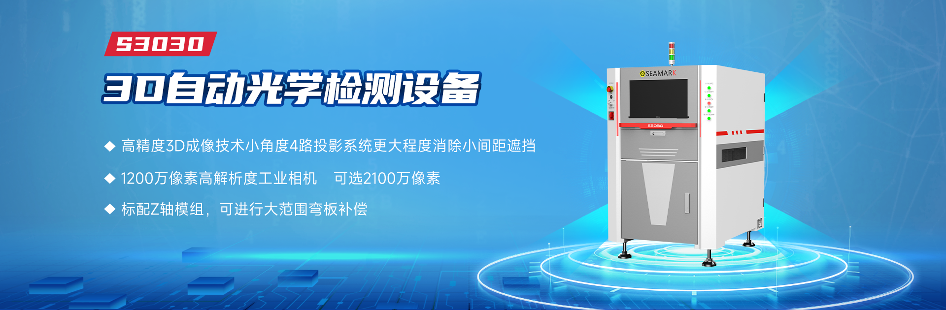S3030是預(yù)編程的SMT爐前爐后貼片自動(dòng)光學(xué)檢查設(shè)備搭載多角度RGBW光源、4路小角度3D投影系統(tǒng)、高分辨率高速相機(jī)及遠(yuǎn)心鏡頭,標(biāo)配Y軸龍門雙電機(jī)驅(qū)動(dòng)。設(shè)備采用“2D+3D融合檢測(cè)”,通過(guò)3D成像獲取元器件與焊點(diǎn)三維數(shù)據(jù),結(jié)合2D平面信息實(shí)現(xiàn)全方位檢測(cè),尤其適用于高密度、小型化元器件。其實(shí)現(xiàn)3D在線自動(dòng)光學(xué)檢查,可檢測(cè)缺件、偏移、反向、浮高、側(cè)立、立碑、焊點(diǎn)不良、錫珠、氧化污染、異物、劃傷等SMT電路板缺陷。